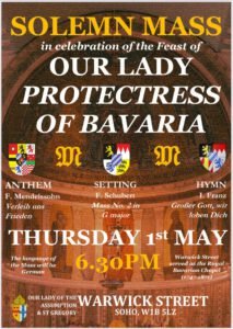 The Feast of our Lady, Protectress of Bavaria Mass will be celebrated that day in German, and the Celebrant will be Fr Daniel Lloyd, a Priest of the Ordinariate. Music will include Schubert’s Mass in G major, and Mendelssohn’s anthem Verleih uns Freiden.